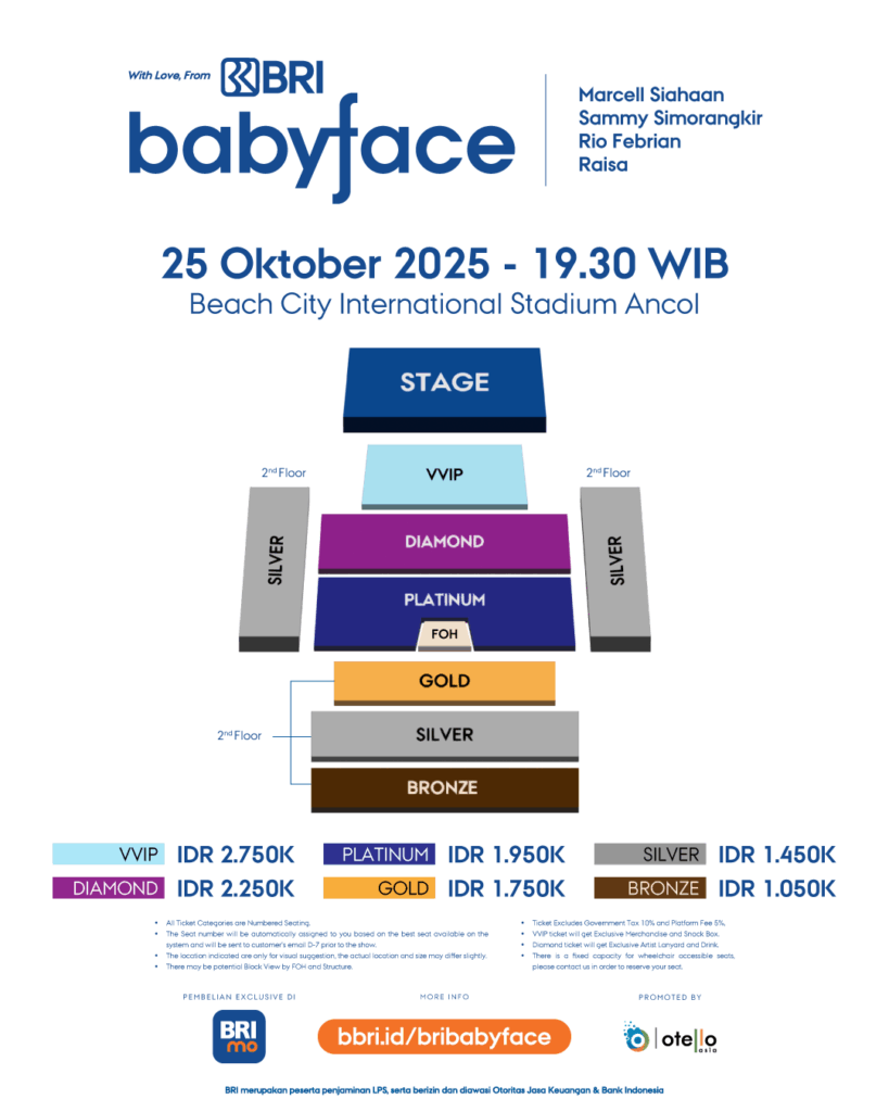 Sementara itu, Sysan Ibrahim, CEO Otello Asia, menyampaikan apresiasinya terhadap kolaborasi bersama BRI. “Dengan dukungan With Love From BRI, kami dapat menghadirkan kesempatan spesial bagi penonton untuk menikmati konser Babyface dengan harga lebih terjangkau. Cukup dengan bertransaksi melalui BRImo, penonton bisa mendapatkan potongan harga 25% untuk semua kategori tiket selama periode 9 hingga 25 Oktober 2025. Ini menjadi bentuk apresiasi kami kepada penggemar yang sudah lama menantikan Babyface kembali ke Jakarta,” jelasnya.