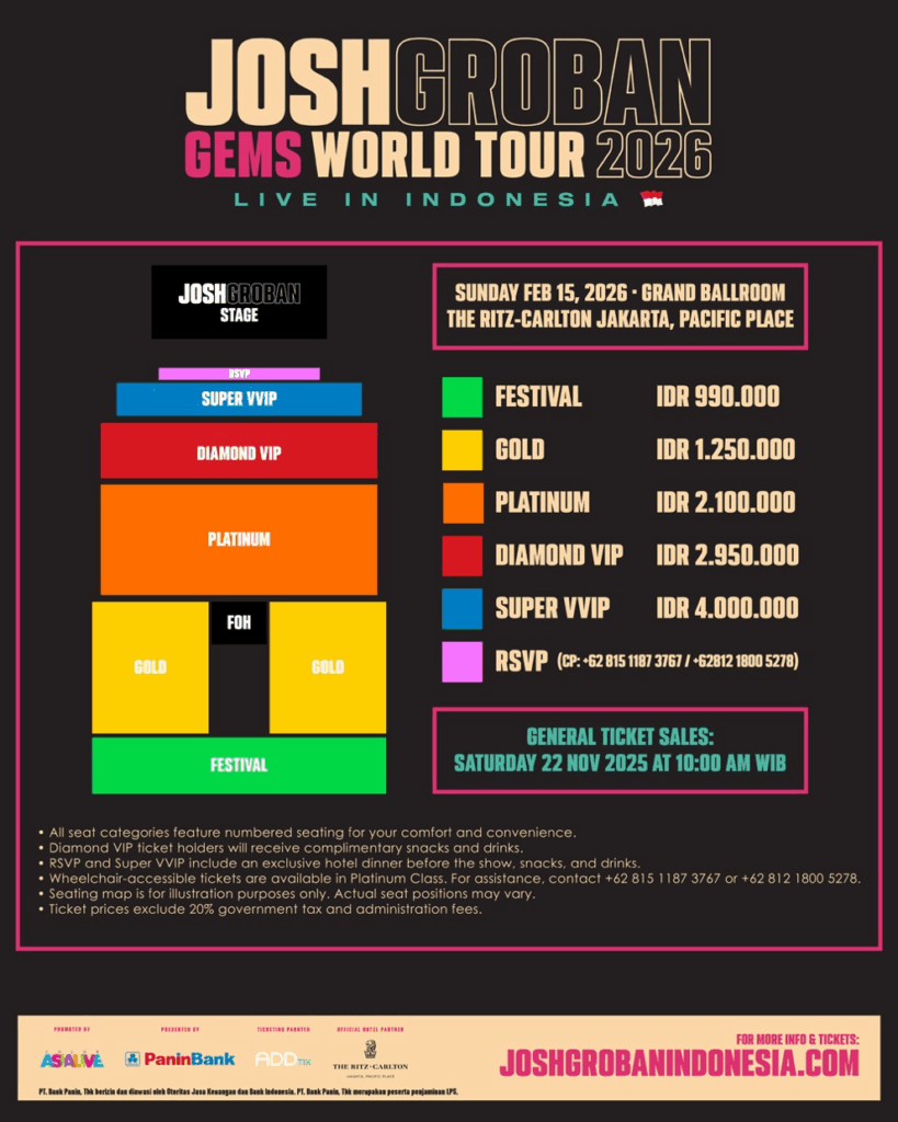 Penjualan tiket umum akan dimulai pada Sabtu, 22 November 2025 pukul 10.00 WIB, dan tiket dapat dibeli melalui situs resmi www.joshgrobanindonesia.com, dengan jumlah kursi terbatas untuk konser eksklusif Josh Groban di Jakarta.